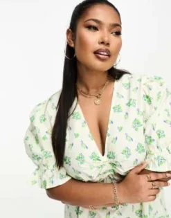 ASOS DESIGN Curve – Vestito Grembiule Midi In Cotone Con Stampa A Fiori Verdi Su Base Color Crema