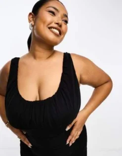ASOS DESIGN Curve – Vestito Midi A Portafoglio Blu Raccolto In Vita Con Maniche A Campana E Colletto