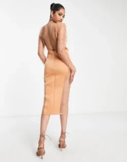ASOS DESIGN – Vestito Midi Longuette Con Inserti In Rete Glitterata Con Perle Color Cammello