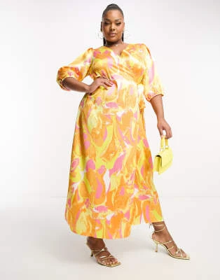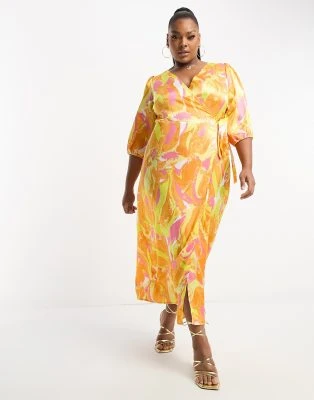 Flounce London Plus – Vestito Lungo Con Maniche Con Volant E Scollo Profondo In Raso Rosa Vivace