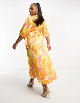 ASOS LUXE Curve – Vestito Midi Decorato Bianco E Blu A Fiori Con Maniche A Sbuffo